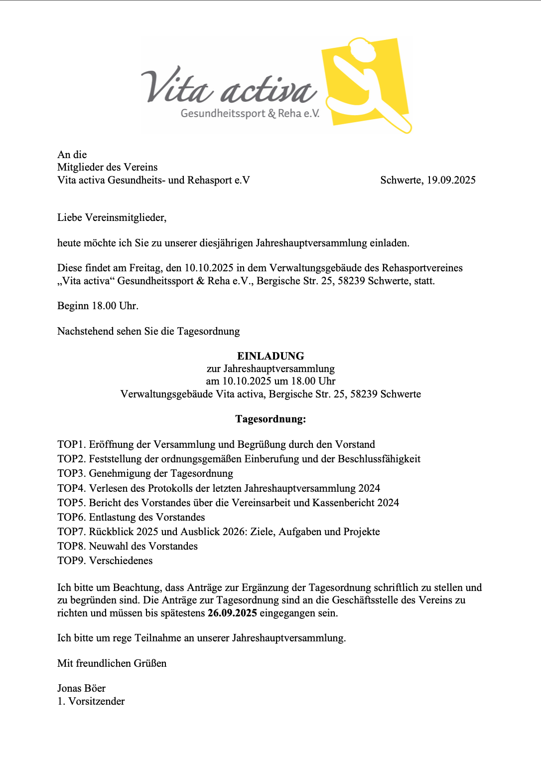 Liebe Vereinsmitglieder, heute möchte ich Sie zu unserer diesjährigen Jahreshauptversammlung einladen. Diese findet am Montag, den 16.12.2024 in dem Verwaltungsgebäude des Rehasportvereines „Vita activa“...